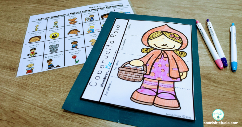 Help students explore the characters in more depth by describing their traits in Spanish. Use worksheets that prompt students to describe characters like el lobo (the wolf) or Caperucita (Little Red Riding Hood) using adjectives. Including visuals and word banks ensures the activity is accessible for all learners.