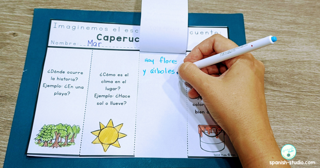 Fairy tales naturally lend themselves to discussion, making them perfect for conversation practice. Use prompts like, “¿Qué piensas del lobo en la historia?” (What do you think about the wolf in the story?), to get students talking in Spanish. This activity promotes fluency, while keeping the mood light and playful.