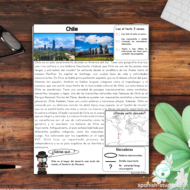 This nonfiction unit in Spanish provides a wonderful opportunity to incorporate Close Reading into your classroom. Focused on Chile, one of the fascinating countries in Spanish-speaking regions, it is specifically designed to offer students multiple, engaging, hands-on opportunities to explore Chile, its customs, cuisine, traditions, geography, climate, and more. It serves as a valuable resource for enhancing their reading, writing, and speaking skills in the Spanish language.